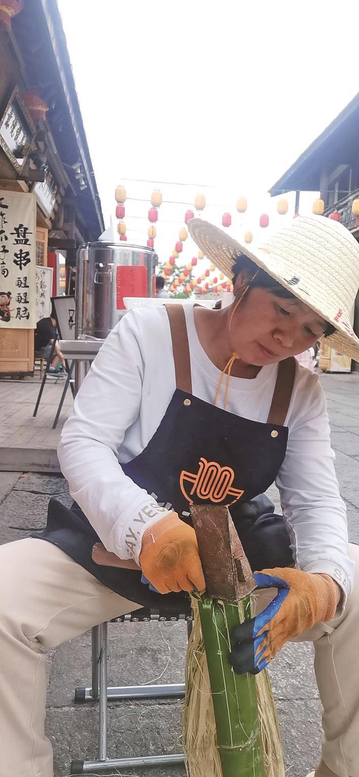 从今年2月开始,胡素琴一有空就做竹鞋。看店时,她会在店门口打竹丝,这场景吸引了很多游客围观,成了东门古街的一道风景。