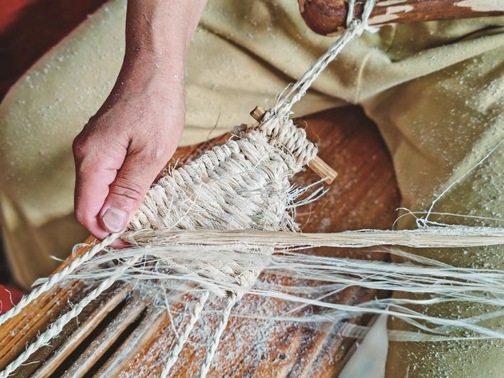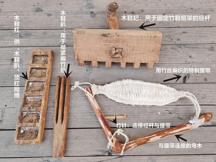和制作竹丝相比,编织竹鞋相对简单。先把竹丝搓成一定规格的竹绳做经杆,搓绳要紧实。最后借助木鞋耙、木鞋扛、木鞋扒等工具,在巧手下完成竹鞋编织。