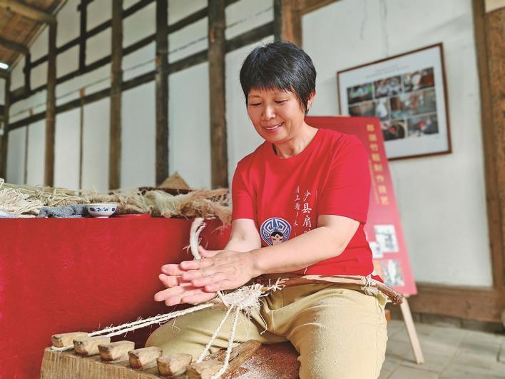 胡素琴在沙县区非遗展示厅编织竹鞋。