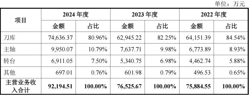 在2022年、2023年、2024年(简称“报告期”),冈田智能的主营业务收入来自刀库、主轴、转台等业务,其中刀库营收占比均超80%;主轴营收占比约10%;其他项目营收占比较低。