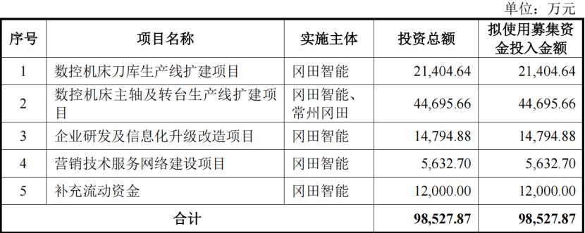 本次IPO,公司拟募资约9.85亿元,资金将投向数控机床刀库生产线扩建项目、数控机床主轴及转台生产线扩建项目、企业研发及信息化升级改造项目、营销技术服务网络建设项目以及补充流动资金。