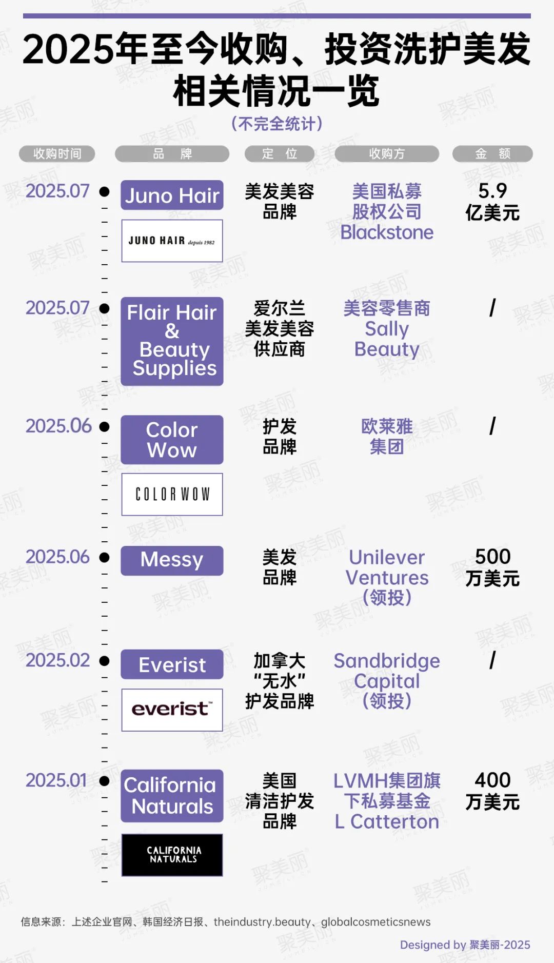 聚焦国际视角,经聚美丽不完全统计,2025年至今收购、投资洗护美发的事件有6例。在该领域投资中,领投的不乏联合利华、LVMH集团等美妆巨头旗下的投资部门。