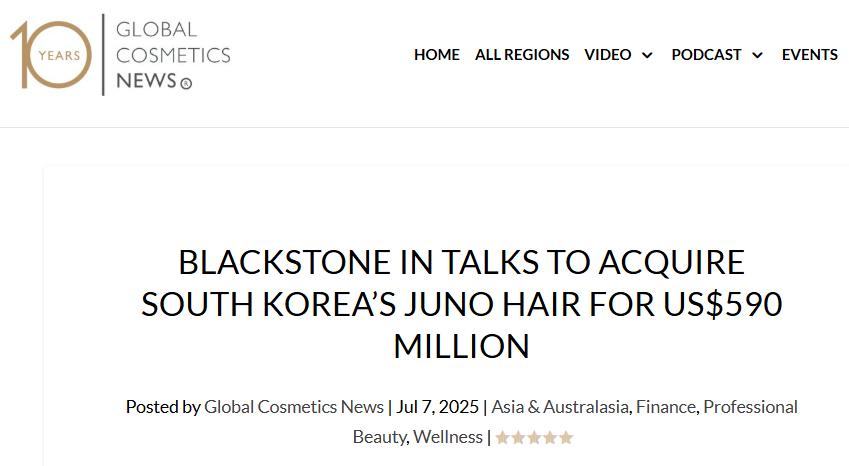 眼下,又一美发领域相关收购引发业内关注。7月7日,据globalcosmeticsnews报道,美国私募股权公司黑石集团(Blackstone)拟以5.9亿美元(约合人民币42.33亿元)收购韩国最大的高级沙龙连锁店Juno Hair,该交易正处于谈判中。