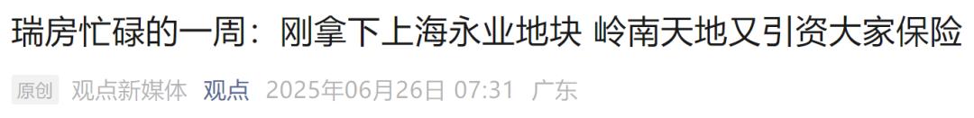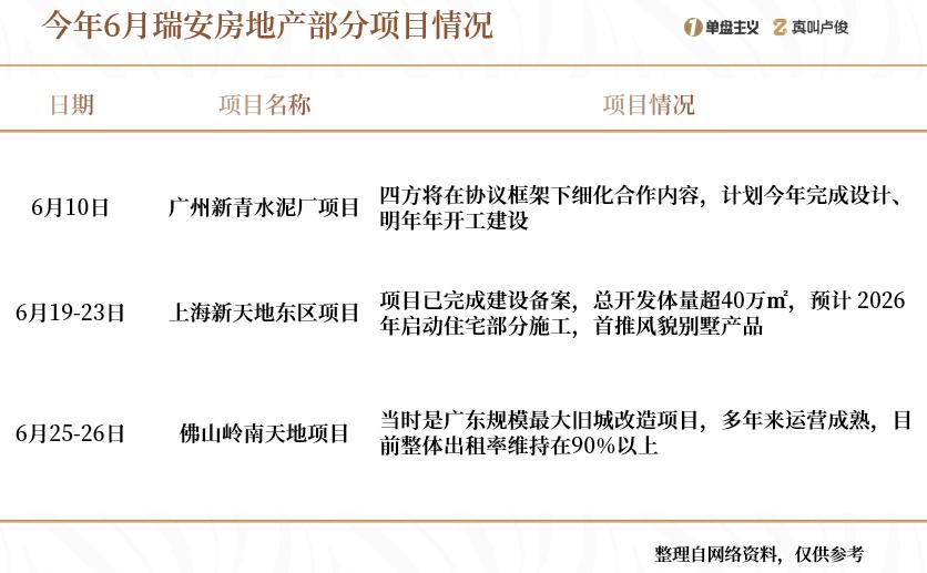 6月25日,瑞安为广东佛山岭南天地项目公司引入险资,实行“轻资产策略”,获6.83亿元管理收入,降低风险并提升资金使用效率。