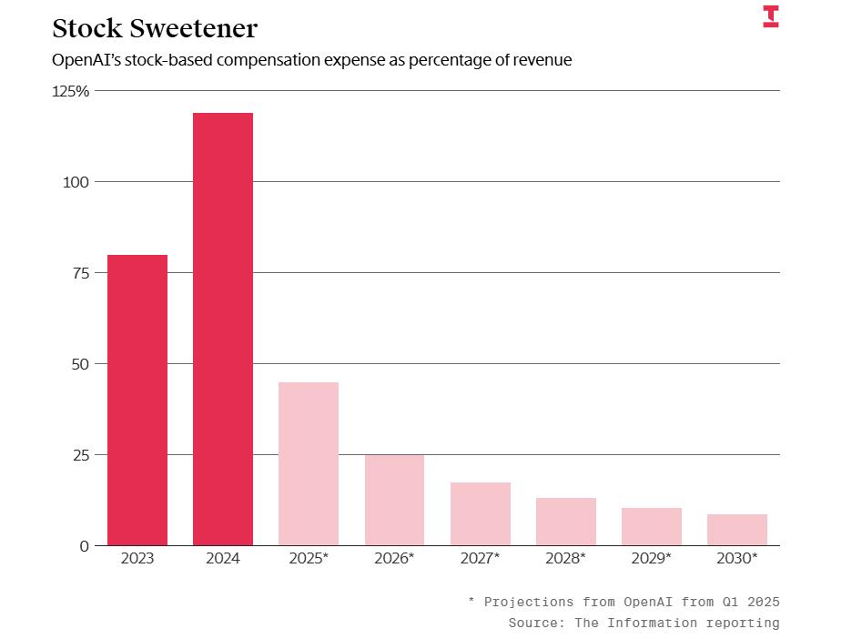 - OpenAI股票薪酬开支2024年飙升至收入的119%。