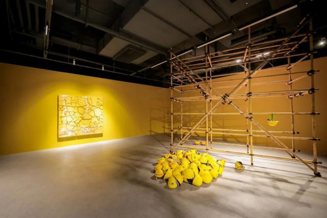 在展览现场,脚手架、安全帽等亲历物证与色彩作品相互交织,营造出独特的“人生剧场”氛围。李向阳表示,这些作品的材料都源自他熟悉的生活印记,在二十多年间不断生长变化,宛如生命旅途中“零零碎碎的沿途风景”。