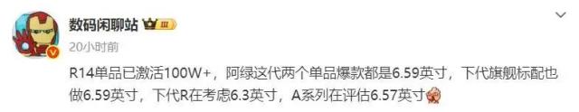 博主@数码闲聊站此前爆料称,OPPO这代两个单品爆款都是6.59英寸,下代旗舰标配也采用6.59英寸,下代R系列考虑采用6.3英寸,A系列在评估6.57英寸。