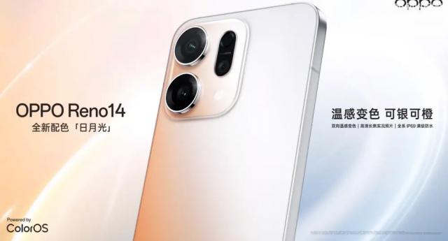 据介绍,OPPO Reno14全球首发双向温感变色技术,带来全新配色日月光。一台手机呈现两种色彩,会随温度变化而改变,遇冷变为橙色,遇热变为银色,仿佛日月双生。其橙色取自太阳光谱中光而不耀的色彩,银色则采撷自月亮的温柔沉静辉光。