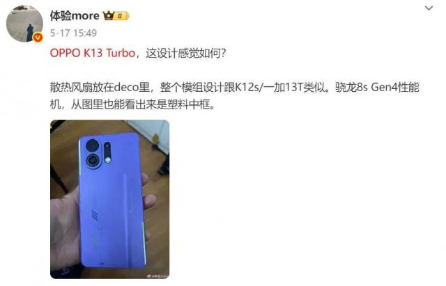 前段时间,博主@体验more公布了OPPO K13 Turbo系列手机的外观设计。新机将采用机甲元素后盖设计、配备主动散热风扇(散热风扇放在Deco里),整个模组设计跟K12s / 一加13T类似。