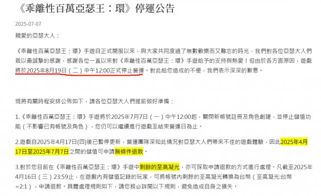 根据官方停运公告,《乖离性百万亚瑟王:环》将在2025年8月19日中午12点正式停运。该产品已于昨日中午关闭新账号注册、角色创建和充值服务,并为今年4月17日 - 7月7日间充值的用户提供无条件退款。