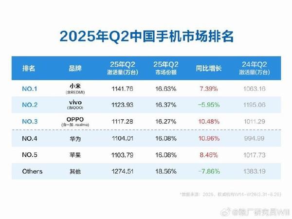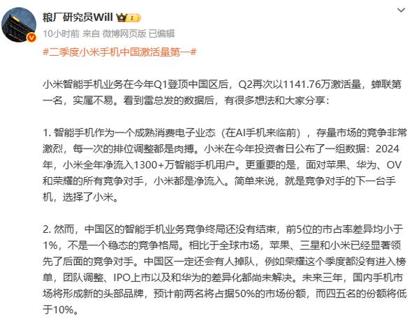 【CNMO 科技消息】依据小米公司董事长雷军转发的数据,小米智能手机业务在中国市场依旧保持着强劲的发展态势。在 2024 年第一季度成功登顶之后,第二季度小米凭借 1141.76 万的激活量,再次荣登中国市场榜首。之后,有博主引用相关数据称,未来三年会有新的中国手机头部品牌出现。