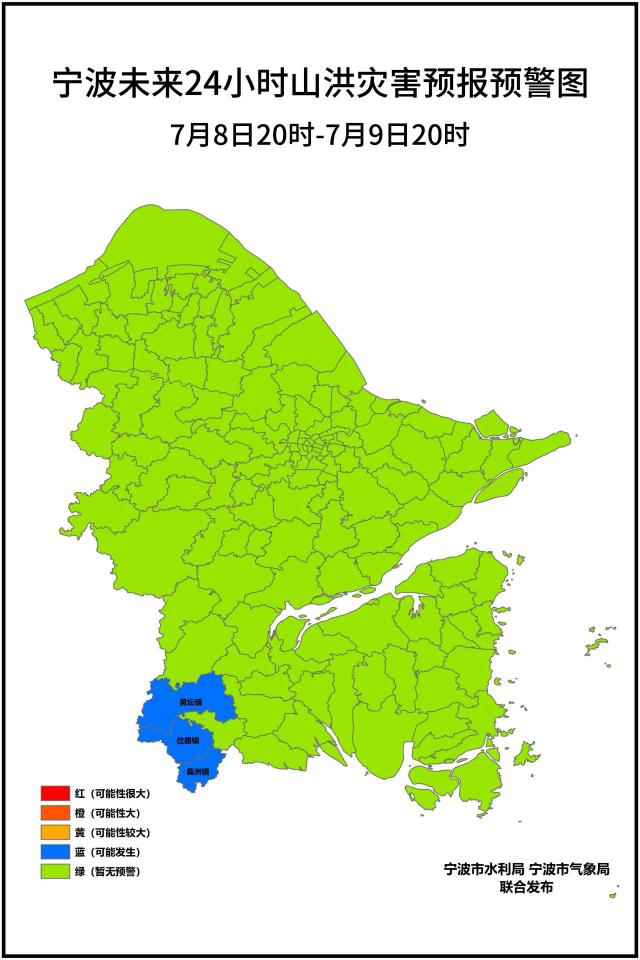宁波市水利局、宁波市气象局2025年7月8日17时联合发布山洪灾害蓝色预警,预计7月8日20时 - 7月9日20时,我市宁海县岔路镇、桑洲镇、黄坛镇山洪灾害预警等级为蓝色,可能发生山洪灾害(Ⅳ级)。请公众注意防范山洪风险。