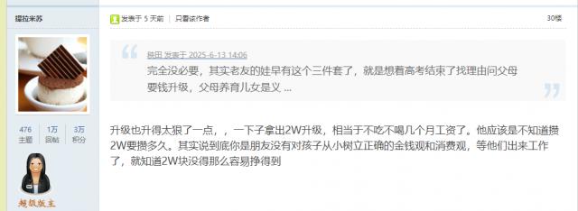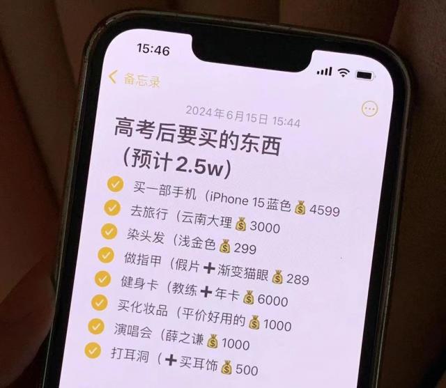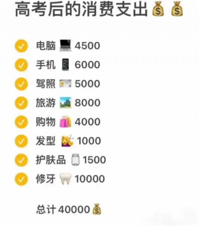 经济条件好的家庭,咬咬牙还能满足孩子的要求,但对于条件一般的家庭来说,就陷入了两难的境地:不买吧,觉得亏欠了孩子;买吧,又实在拿不出这么多钱。某红书上,有个女孩列了个近一万元的购物清单,包括苹果手机和各种化妆品,被家长拒绝后,她伤心发帖哭诉:查完分数才知道家里一万块钱都拿不出。