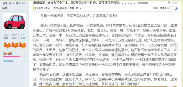 高考结束后,桂林一个本地社交平台上,有网友发了个帖子:娃娃考了个三本,要2万买毕业三件套,该买还是不该买?原来,是他朋友的孩子,估分大概率上三本,成绩还没出,就向朋友要2万块钱买三件套。朋友诉苦说,孩子要是上了三本,每年学费就是一大笔,综合算下来每月支出超过5000元,已经超出了桂林市的平均工资水平。现在还没上大学,又要2万,实在负担不起。网友给朋友出主意,说2万还是存着交学费吧,孩子都满18岁了,想要新手机新电脑,可以自己想办法挣,父母又不是提款机。