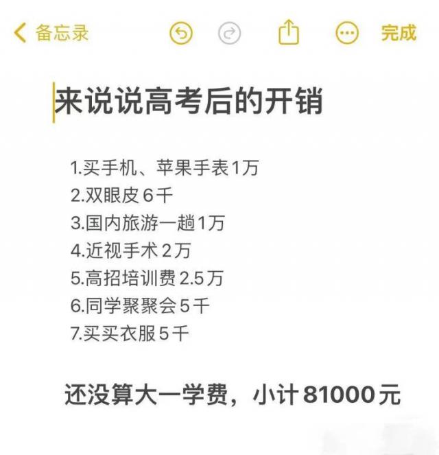 我有个远房亲戚的女儿今年高考,聊天时她给我算了笔账,高考后的这个暑假,保守估计至少要支出3万:电脑加手机1.5万,考驾照5000,旅游5000,同学聚会零花钱5000。不得不说,孩子真是“四脚吞金兽”。小的时候,孩子要上培训班,看眼睛、牙齿,甚至还要想办法增高,处处都得花钱;好不容易孩子成年高中毕业,家长的钱包还是要遭受“暴击”。