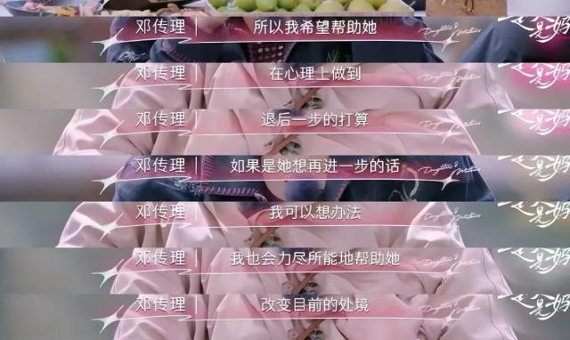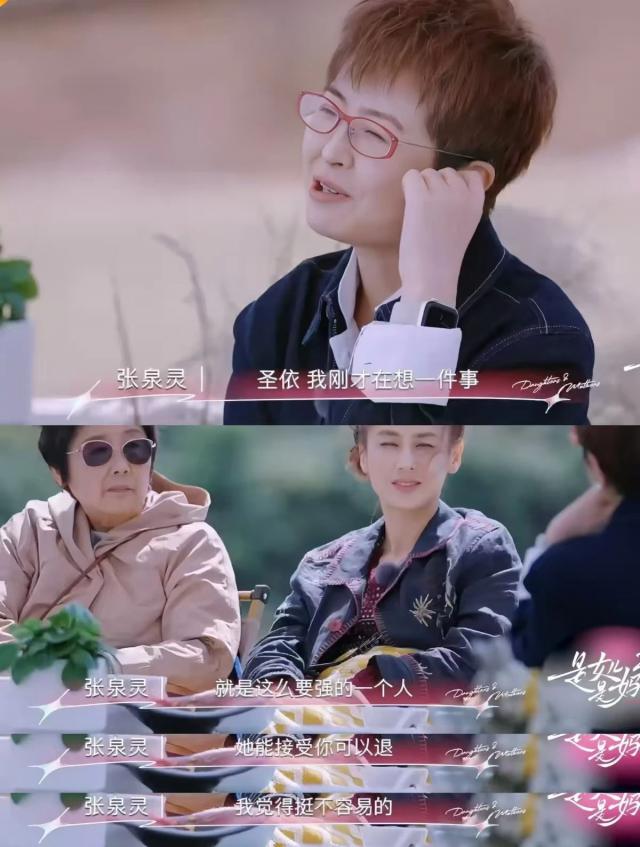 《是妈妈是女儿》里,黄圣依妈妈邓传理说:如果圣依想再进一步,她会尽力帮助她;如果市场环境不好,她想退后一步,她也会帮助她完成。
