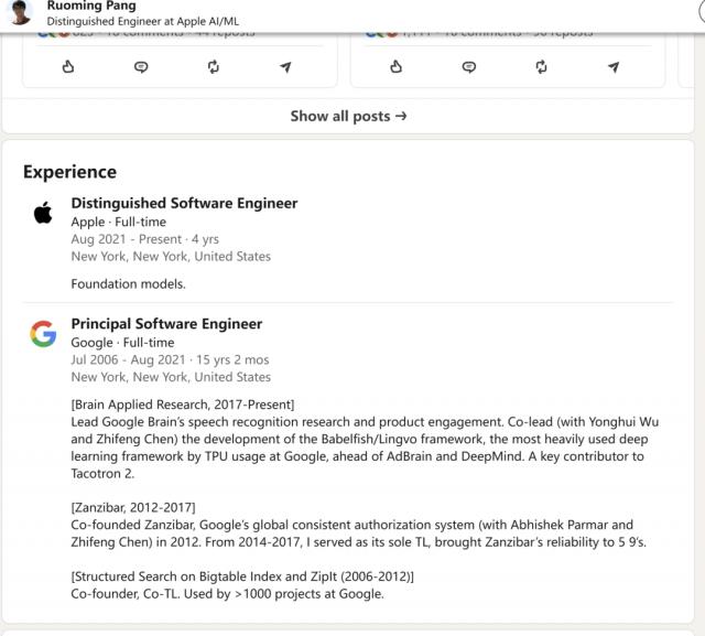 2021年,庞若鸣结束在谷歌长达15年的工程师生涯,加入苹果。他拥有深厚的技术背景:本科毕业于上海交通大学,随后在南加州大学获得硕士学位,并在普林斯顿大学取得计算机科学博士学位。