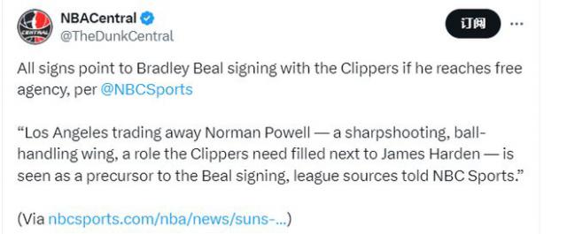 联盟消息人士告诉NBC体育,快船队交易走诺曼 - 鲍威尔,这位擅长远投和控球的侧翼球员,而这正是快船队在哈登身边所需要的角色,这一交易被视为签约比尔的前奏。虽然比尔可以顶替邓恩进入快船队的后场首发,但从防守角度看,让比尔带领第二阵容出场是更好的安排,阵容里包括约翰 - 科林斯(除非科林斯首发,小德里克 - 琼斯替补出场)、博格丹 - 博格达诺维奇和布鲁克 - 洛佩斯。快船队可以为比尔提供他们剩余的中产特例(估计约为530万美元)或薪金空间特例(510万美元)。