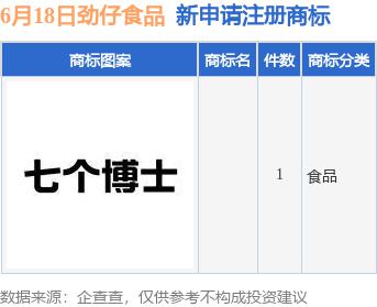 据证券之星消息,天眼查APP数据显示,近日劲仔食品集团股份有限公司新提交了1件商标注册申请。商标申请详情如下: