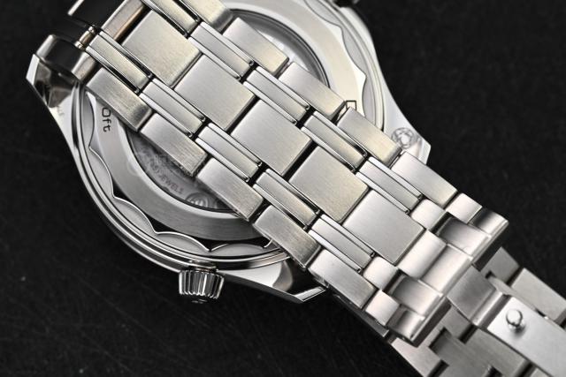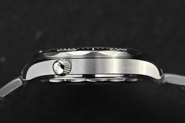 表径 42 毫米,表壳厚度 13.6 毫米,这个尺寸在潜水表中比较中规中矩。表壳表带都采用精钢材质,表链是可调节表链,能轻松调试松紧,还有可延长功能,方便潜水时使用。