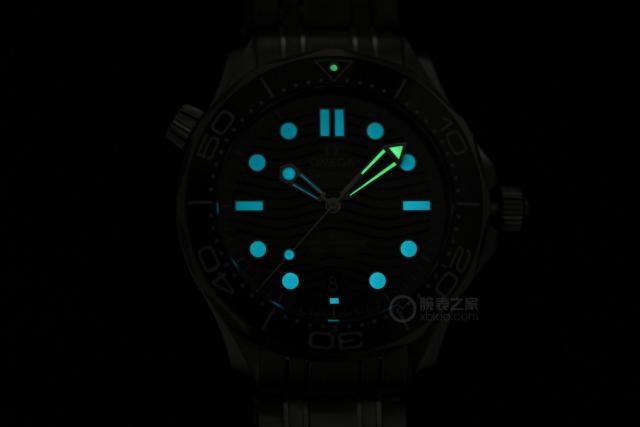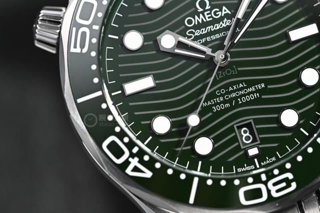 自 1948 年海马系列专业技术潜水手表面世,经过时间的检验和打磨,如今欧米茄海马系列已凭借靠谱、耐用的特点在腕表界闻名。这只潜水表是海马系列首次采用绿色表盘,推出后反响很好。先看表盘,盘面由抛光绿色陶瓷制成,极光镌刻出波浪形纹理,仿佛透过盘面能看到波涛翻涌的海面。