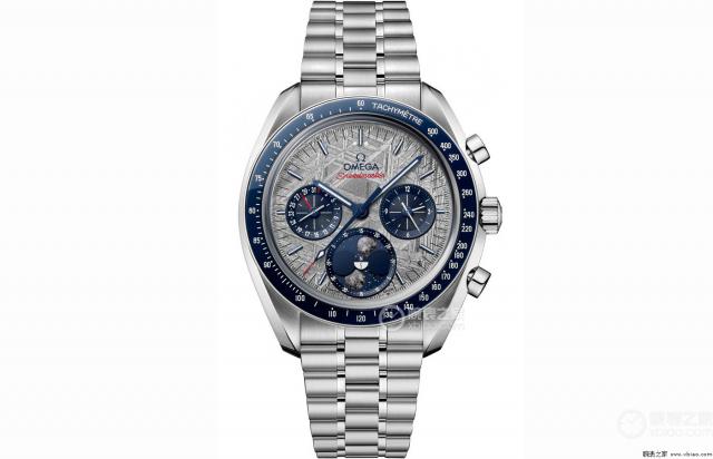 腕表点评:在十五万元以内的价位,欧米茄年初一月发布的超霸系列双月相腕表陨石款堪称开年重磅。就像这款蓝灰配色的陨石款(型号:304.30.43.52.06.001),43毫米的尺寸,精钢表壳,蓝色陶瓷表圈搭配白色珐琅测速刻度。重点是表盘采用真陨石材质,每个盘面纹理独特,还运用PVD或电镀色彩工艺呈现色彩。它也是欧米茄首款同时显示南北半球月相的双月相腕表,6点位处有两个由稀有月球陨石打造的弧面形月球。3点位设有60分钟和12小时计时盘,9点位的小秒盘兼具日期显示功能。腕表内部搭载全新研发的9914手动上链至臻天文台机芯,可抵御15,000高斯强磁场,拥有60小时动储和50米防水能力。