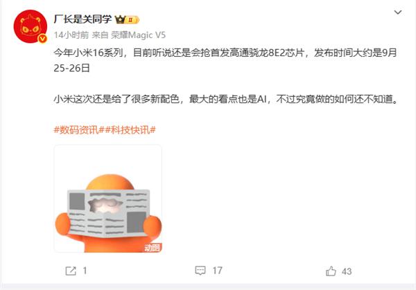 小米16系列或9月25日发布,首发第二代骁龙8至尊版