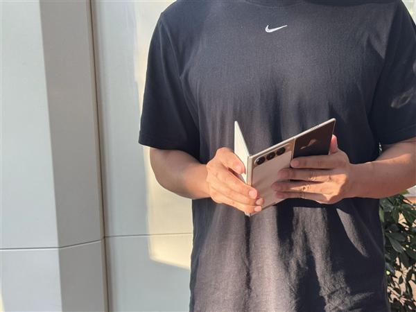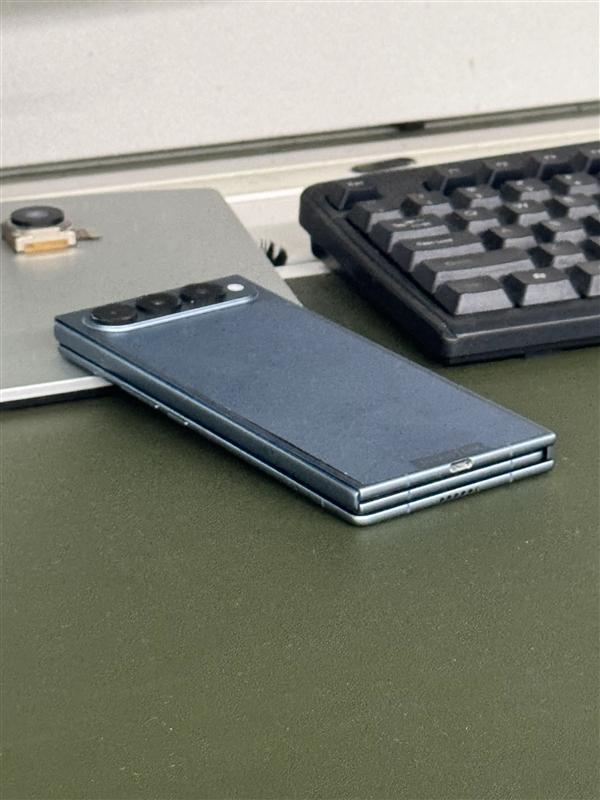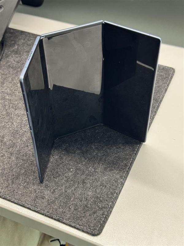 这款三折叠屏手机采用“G”字型折叠方案,左右两块屏幕向中间折叠,这和华为Mate XT非凡大师的“ S ”型折叠方案有很大不同。