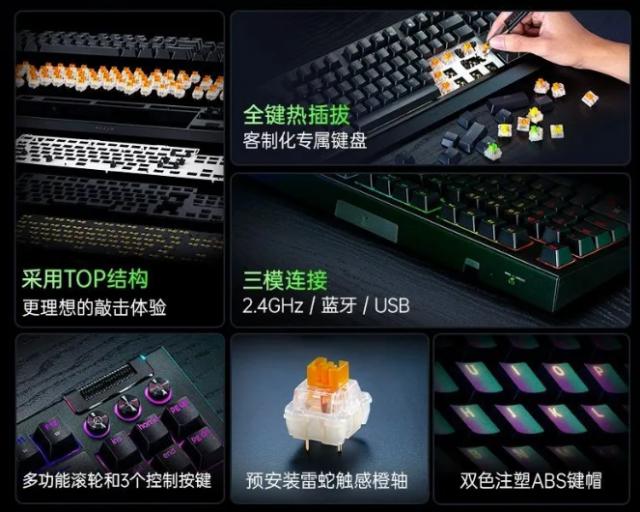 据了解,这款新品采用2.4GHz / 蓝牙 / USB三模连接方式,并且支持在三个蓝牙设备间进行快速切换。它采用全键热插拔设计,配备双色注塑ABS键帽,预先安装了第三代雷蛇触感橙轴。键盘的插座式PCB电路板兼容3脚或5脚机械轴,玩家能够自行挑选并更换自己喜欢的轴体。
