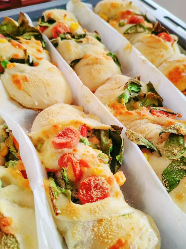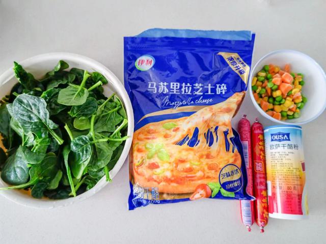 高精面粉 400 克、干酵母 4 克、水 320 克、盐 4 克、食用油 15 克、马苏里拉芝士 30 克、玉米胡萝卜豌豆 20 克、火腿肠两根、菠菜适量、干酪粉。