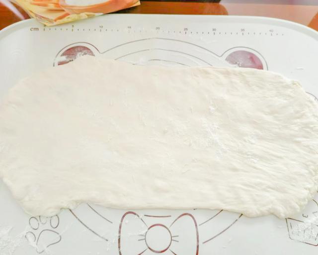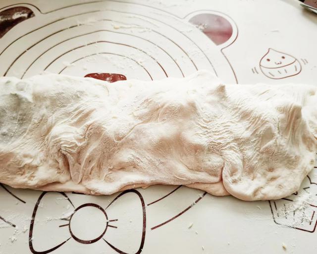 3. 在硅胶垫洒大量面粉防粘,将面团慢慢往四周拉成长方形,不能用擀面杖。
