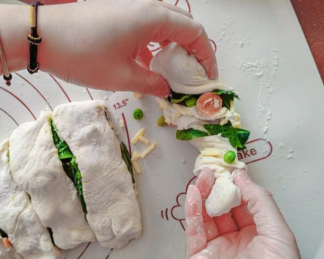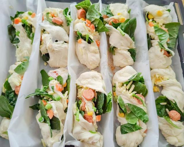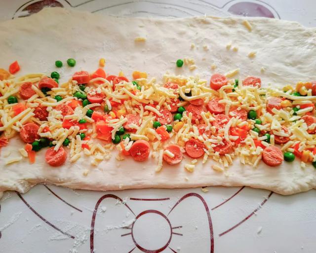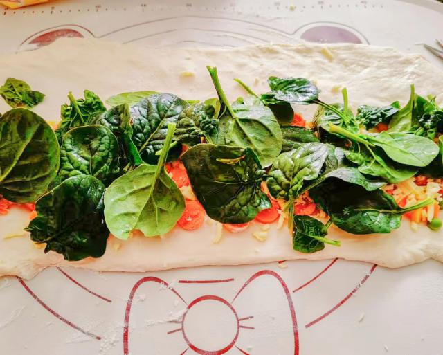 4. 在面团下半部分均匀洒上火腿肠、玉米、胡萝卜、豌豆、马苏里拉芝士、菠菜,可根据个人喜好适当增减用量。