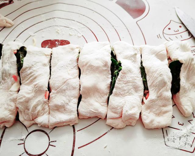 5. 将面团上半部分向下折叠并收口,用刀将面团均匀切成八等份。