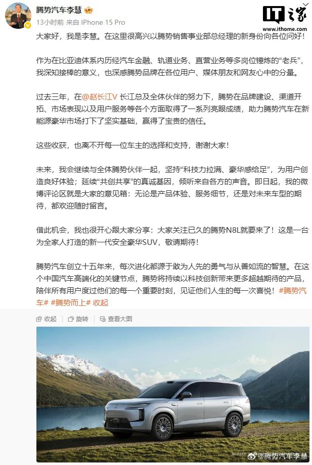 比亚迪李慧上任腾势总经理首发长文,透露腾势N8L豪华SUV即将上市