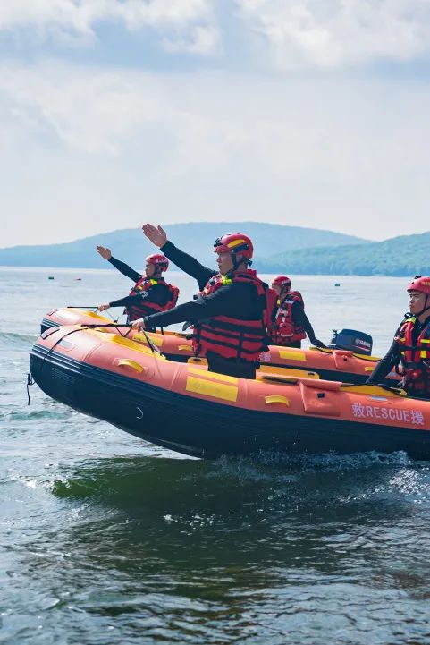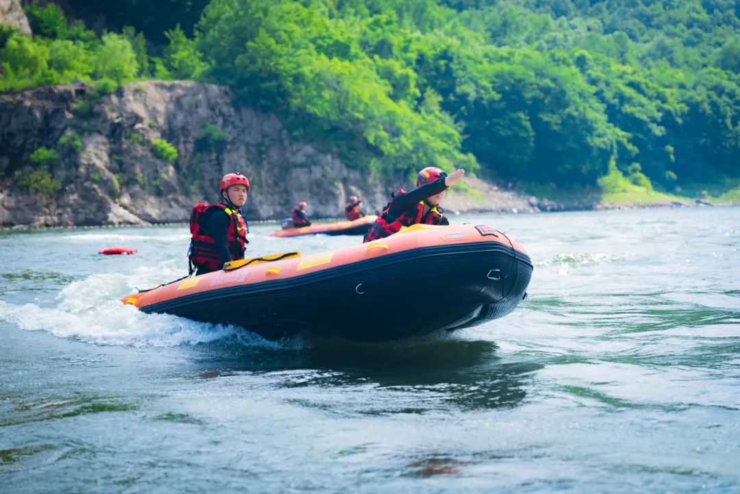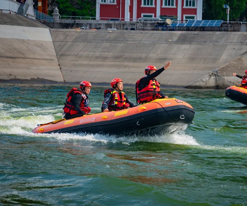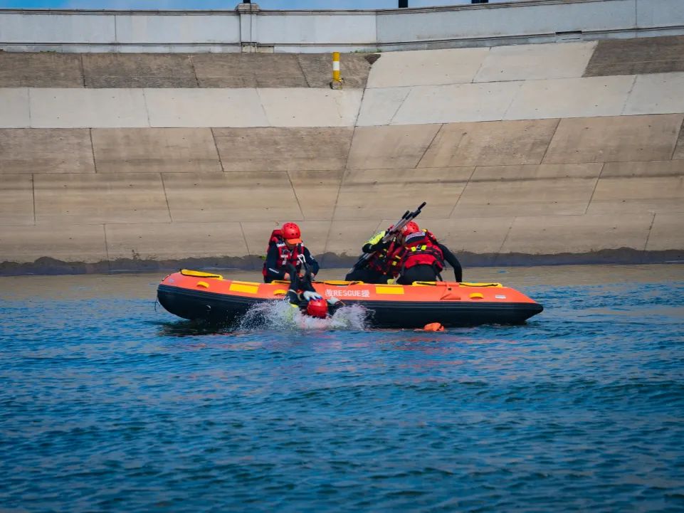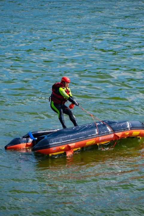 系绳保护下的救援人员以攻击式泳姿靠近溺水者,利用充气式救援艇的机动性和团队协作,实现快速、可控的激流近距离救援。