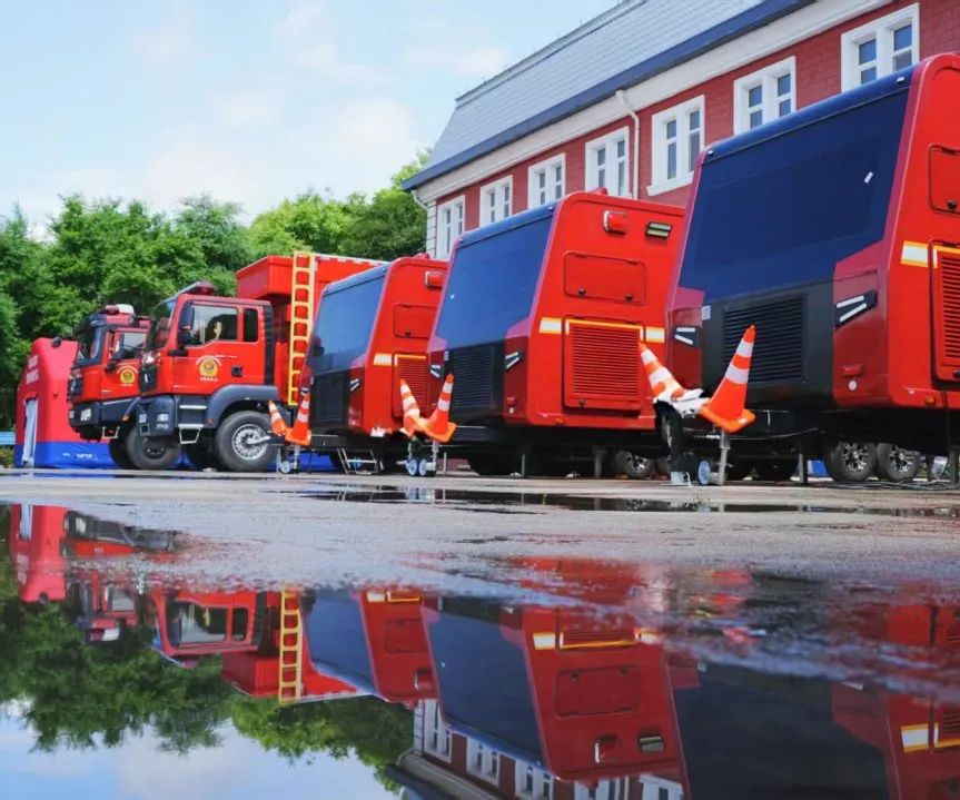 双泵远程供水系统串联作业,9门移动水炮同步强排,以“远距调水+洪涝秒泄”解决“远距离水源获取、大范围积水清除、保持持续作战能力”的难题;部署龙吸水消防车,通过子母车协同配合,凭借其吸排水量大、性能可靠、耐用性强的特点,有效减轻洪涝灾害应急抢险救援的压力。