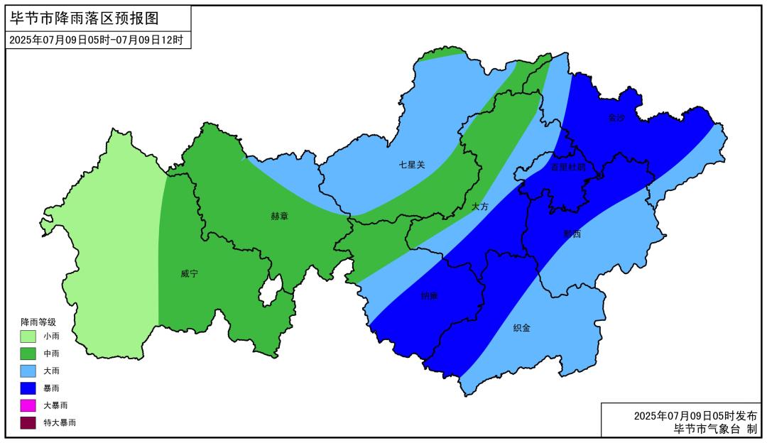 7月9日5时00分,毕节市气象台发布暴雨橙色预警。