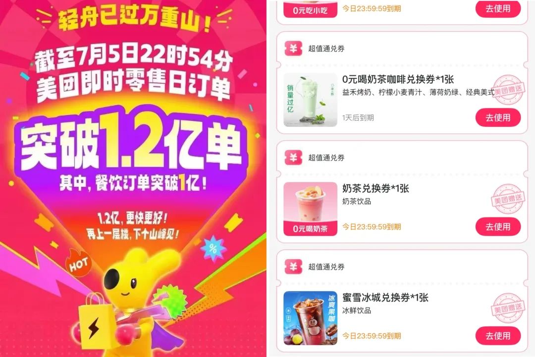 当天有网友称,截至7月5日22时54分,美团内网显示即时零售日订单突破1.2亿单,餐饮订单超1亿单,高于去年立秋“秋天第一杯奶茶”的历史峰值。