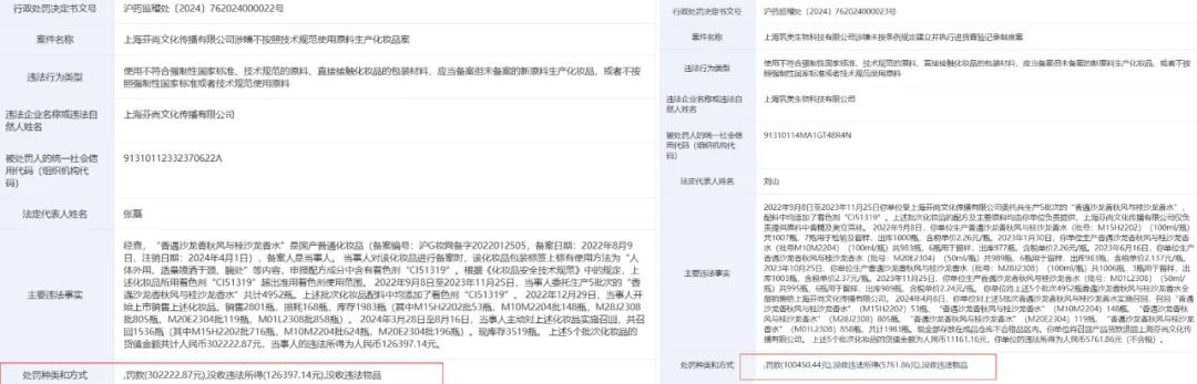 2024年9月6日,香水品牌香遇沙龙香水原料商/品牌商分别因未按条例规定建立并执行进货查验记录制度、不按照技术规范使用原料生产化妆品,双双收到大额罚单。
