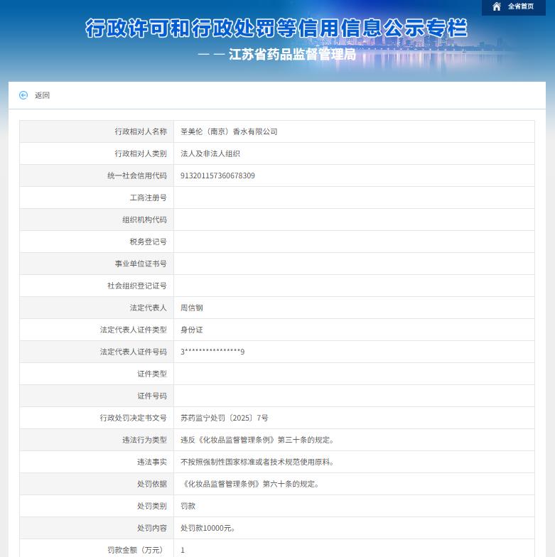 7月7日,聚美丽从江苏省药品监督管理局获悉,圣美伦因未按照强制性国家标准或者技术规范使用原料,违反《化妆品监督管理条例》有关规定,被处以罚款1万元。不过,此次处罚并未明确披露圣美伦公司此次违法行为的具体情况。