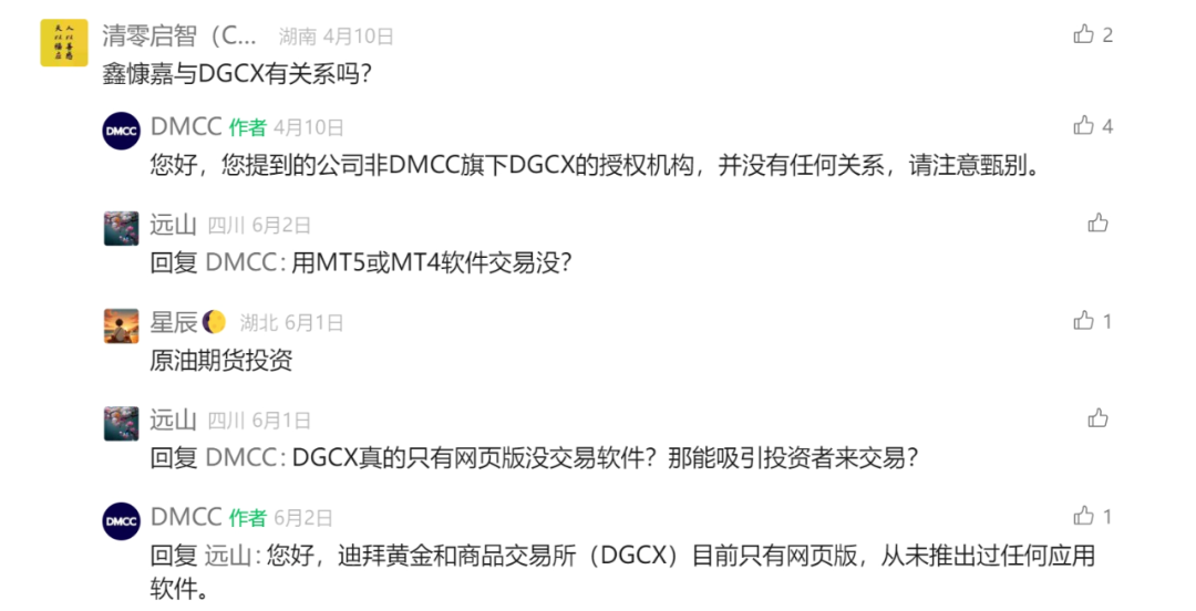 今年4月8日,迪拜黄金和商品交易所(DGCX)发布警示,称在中国无合作伙伴或关联机构,任何声称与其有关联的实体或个人未获授权,网上流传的DGCX应用程序也未获授权或开发,建议投资者警惕。