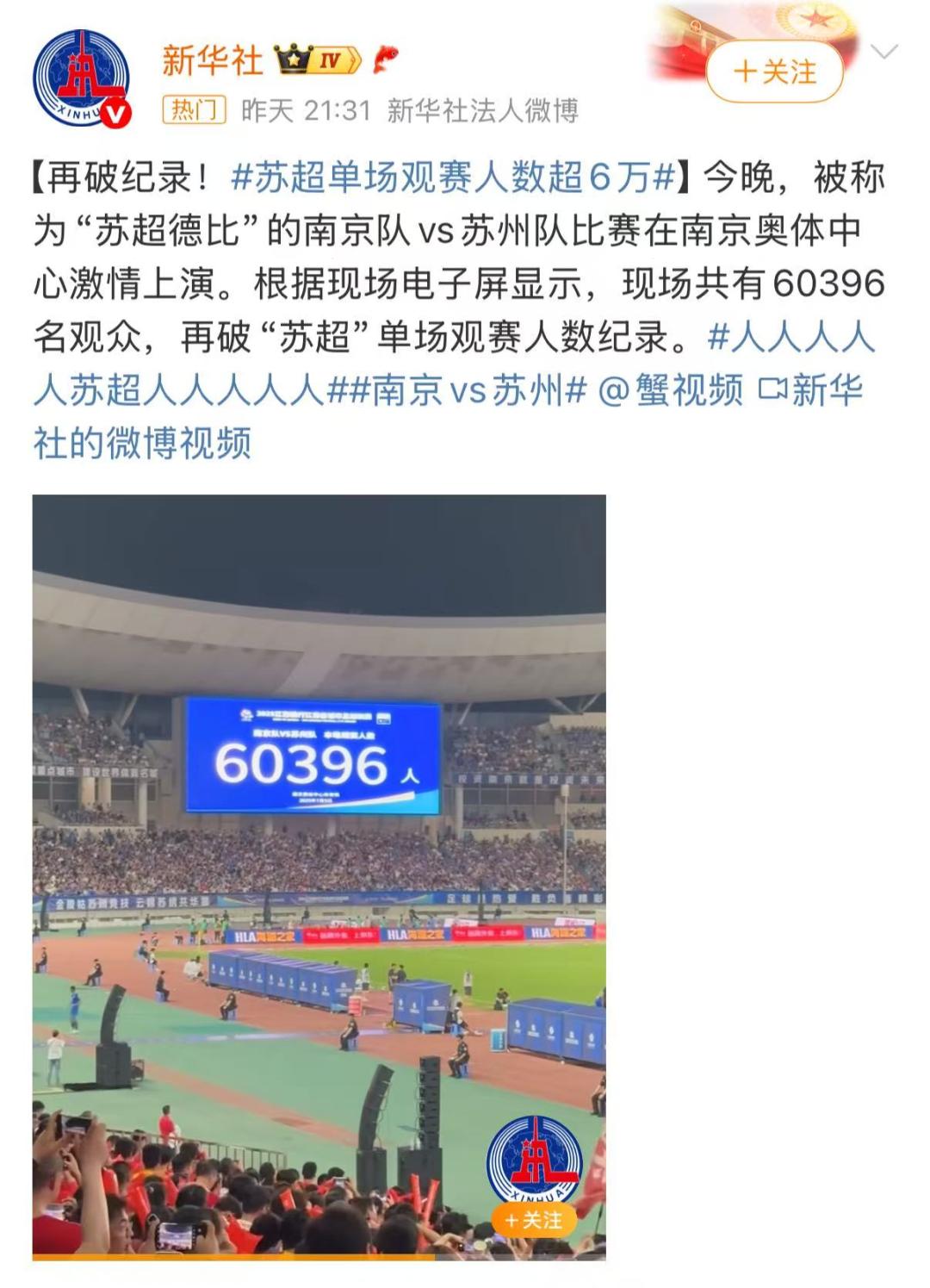 在2025年7月5日晚的“苏超”第6轮南京队主场对阵苏州队的比赛中,南京奥体中心体育场涌入60396名观众。这不仅打破了6天前昆山奥体中心43617人的纪录,更创造了中国业余足球赛事的上座新纪录,该壮举迅速冲上热搜第一,成为全国焦点。