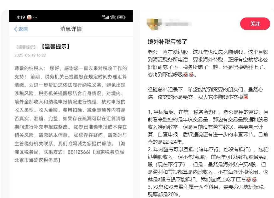 一位完成补税的投资者称“亏惨了”:老公炒港股多年没赚钱,本月突然接到海淀税务所电话要求补海外税款,两人跑了三趟税务所才补上税。
