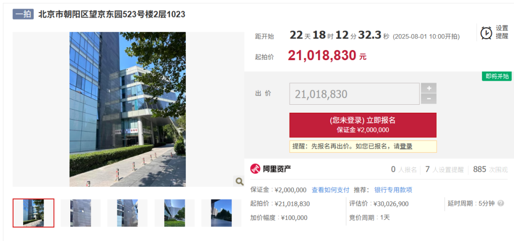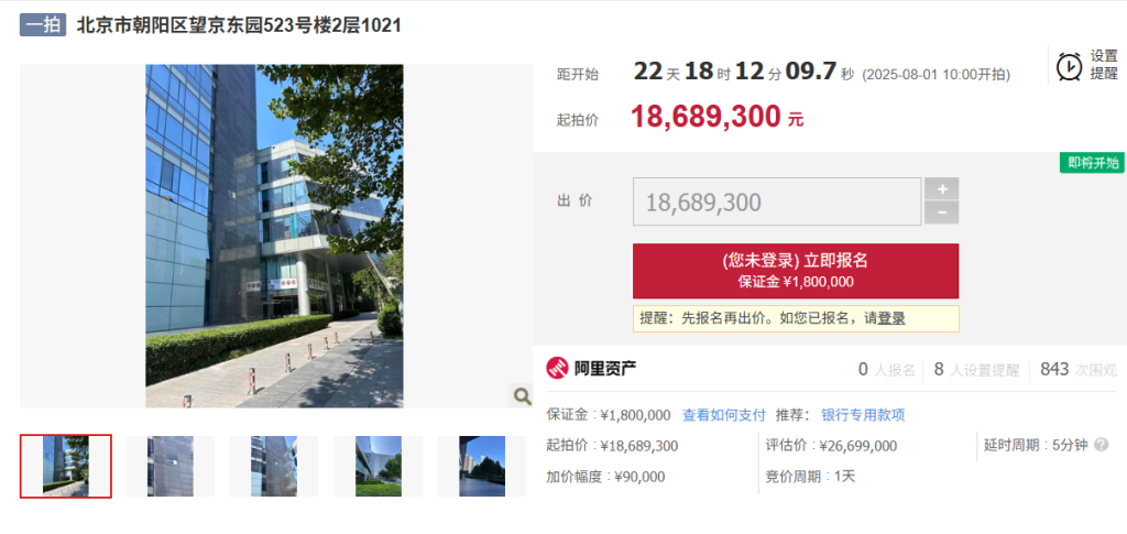 阿里资产拍卖网信息显示,此次拍卖的标的物为北京市朝阳区望京东园523号楼2层1021和1023。其中,1021室起拍价约2101.8万元,1023室起拍价约1868.9万元,均为评估价的七折,8月1日开始竞价,目前均无人报名。
