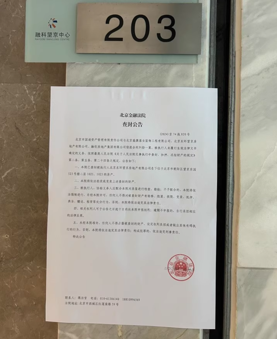 阿里资产的拍卖公告中,这两间办公物业门口张贴的北京金融法院的查封公告【(2024)京执820号】显示:北京市国通资产管理有限责任公司与北京盛康基业装饰工程有限公司、北京东环望京房地产有限公司、融创房地产集团有限公司借款合同纠纷一案,被执行人未履行生效法律文书确定的义务。法院已查封被执行人北京东环望京房地产有限公司名下位于北京市朝阳区望京东园523号楼二层1021、1023的房产,并将依法拍卖、变卖上述查封的财产。