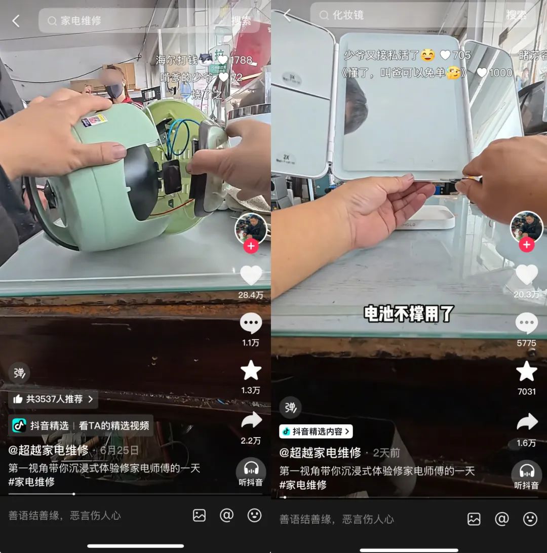 Vlog第一视角的镜头也让大家更沉浸式地感受顾客进店到出店的过程。就像 “家电华佗” 把镜头对准待修的物件,跟着维修动作移动,观众仿佛化身修理师傅,看着故障被一步步拆解、解决。