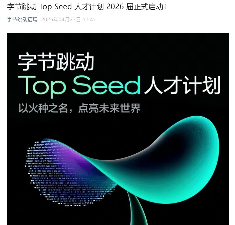 天眼查信息显示,字节跳动通过Top Seed等专项计划,吸引高潜年轻人才,提供高实习薪酬、顶级导师资源与充足算力支持,构建人才招引与培养机制。