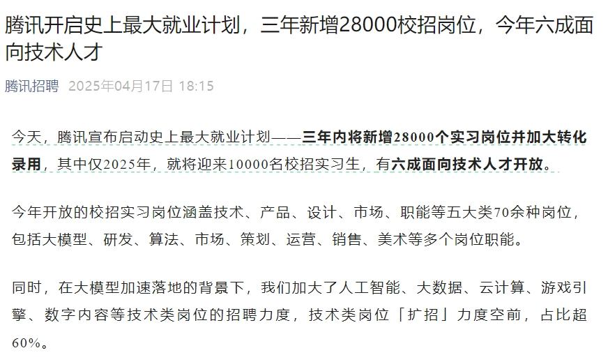 腾讯也开启大规模校招,三年内新增28000个校招实习岗位,2025年迎来10000名校招实习生,技术类占比六成。