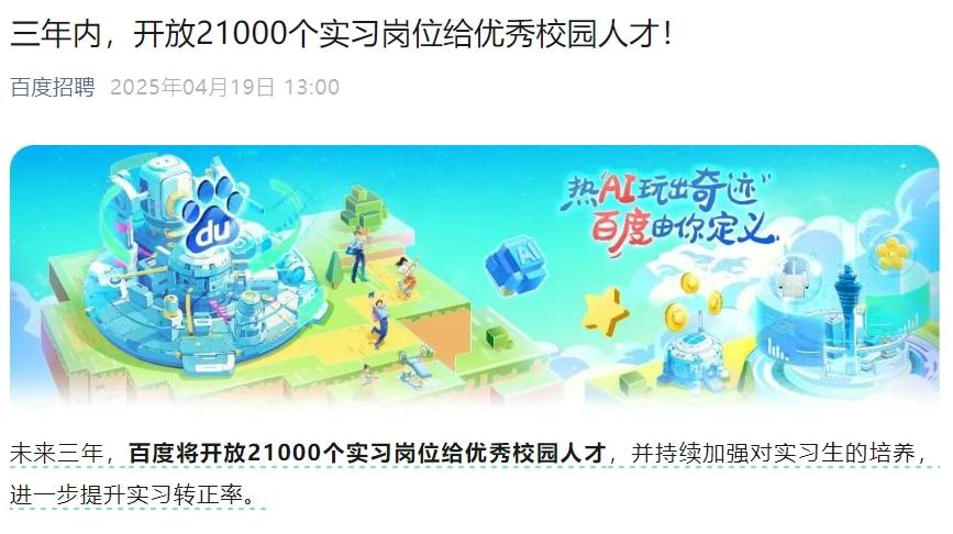 今年3月,百度向在校学生开放3000多个暑期实习岗位,87%与AI相关,覆盖大模型、机器学习、无人驾驶等核心技术方向,展现了对前沿技术场景的开放态度。