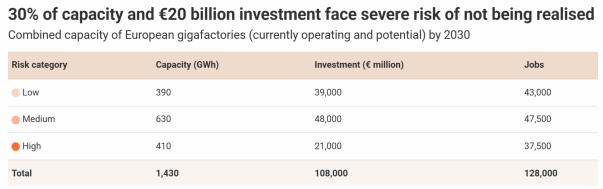 高风险项目处于概念或审批阶段,总计含410GWh年产能、210亿欧元投资和3.7万个就业机会,推进取决于后续产业政策。